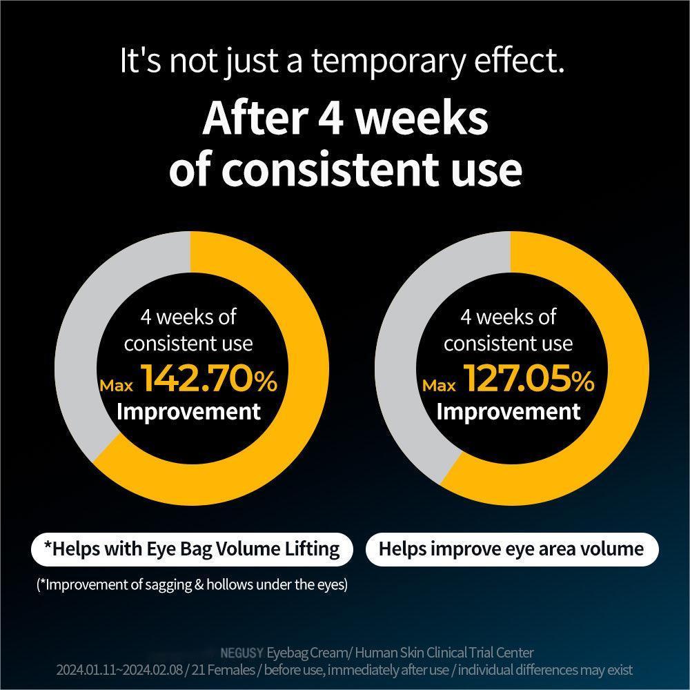 Bio-Spicule,NEGUSY Eyebag Cream's formula is crafted to significantly enhance under-eye skin elasticity and firmness. Each application works deeply to Iift and rejuvenate, promoting noticeable elasticity improvements and offering both immediate and enduring results.